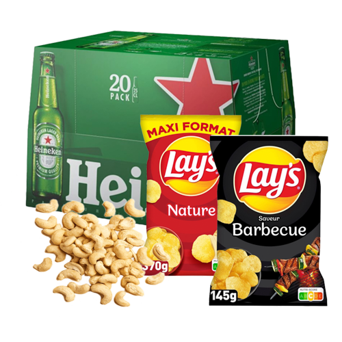 Une offre idéale pour les soirées entre amis : un pack de 20 Heineken accompagné de chips Lays pour un moment convivial à prix malin.