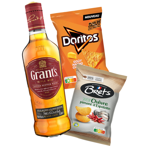 Un whisky de qualité Grants avec des Doritos au fromage, parfait pour une dégustation gourmande et chaleureuse.