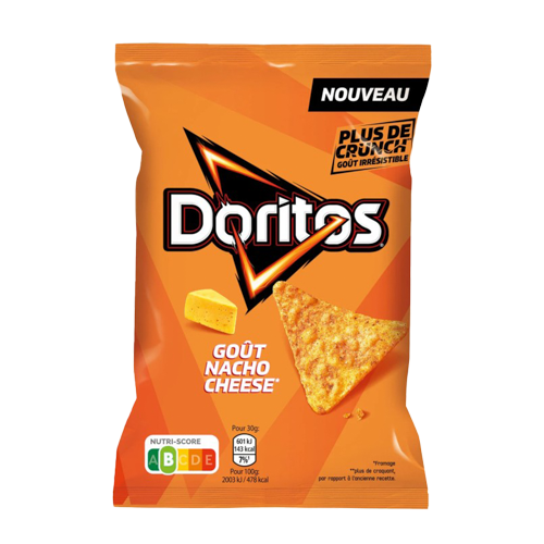 Doritos Nacho Cheese, des triangles de maïs ultra croustillants, enrobés d’un fromage fondant et relevé d’épices.